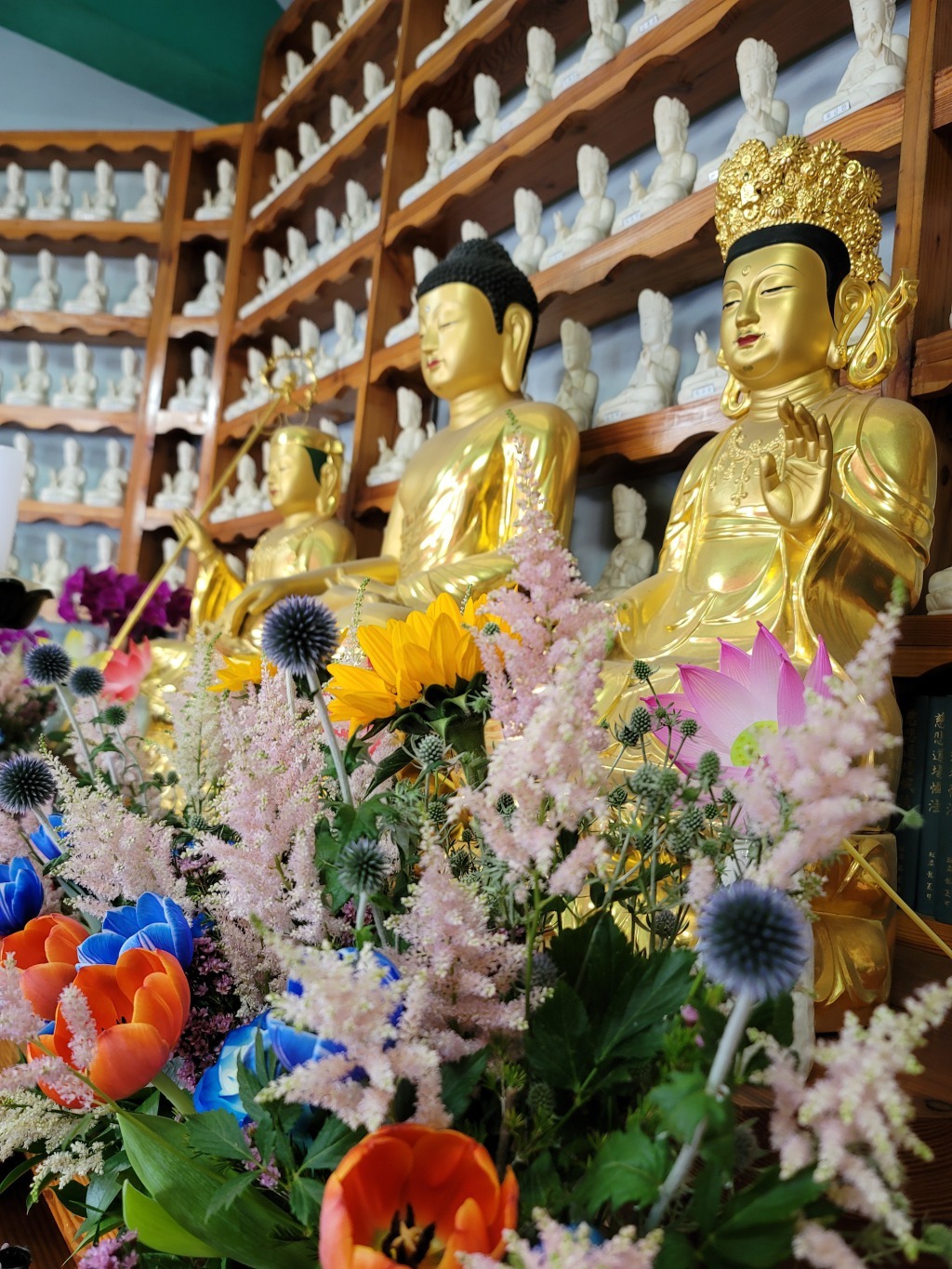 법당 가득 부처님께 꽃공양을 올리십니다.